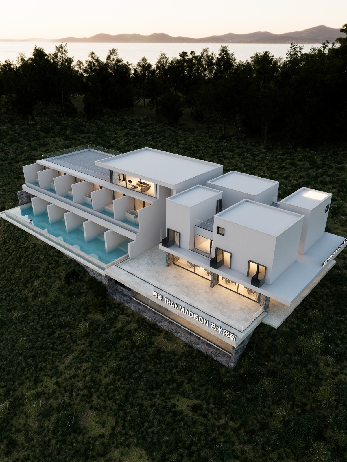 设计的核心概念源于中国传统园林的“借景”哲学,但以现代极简语言重新诠释。建筑形体如一枚“精心打磨的贝壳”,以纯白、流畅的曲线回应坡地地形,减少对环境的视觉冲击。策略上,我们通过多层次“框景”元素组织空间:首层以无边泳池作为“流动的镜面长廊”,既界定私密领域,又将海天景色反射并引入室内;二三层客房的阳台泳池与竖片墙则构成动态画框,裁切出狭长海平面。这种策略不是简单开窗取景,而是通过空间序列(Spatial Sequence)的精心编排——如“借景走廊”中两道片墙夹峙的过道——制造框景的戏剧性转折,使行走过程化为一场视觉探险。建筑在此不再是客体,而是风景的“催化剂”。