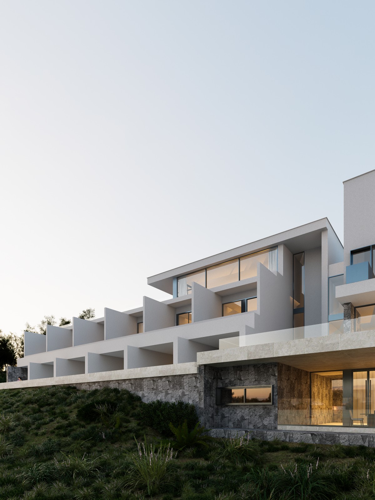 设计的核心概念源于中国传统园林的“借景”哲学,但以现代极简语言重新诠释。建筑形体如一枚“精心打磨的贝壳”,以纯白、流畅的曲线回应坡地地形,减少对环境的视觉冲击。策略上,我们通过多层次“框景”元素组织空间:首层以无边泳池作为“流动的镜面长廊”,既界定私密领域,又将海天景色反射并引入室内;二三层客房的阳台泳池与竖片墙则构成动态画框,裁切出狭长海平面。这种策略不是简单开窗取景,而是通过空间序列(Spatial Sequence)的精心编排——如“借景走廊”中两道片墙夹峙的过道——制造框景的戏剧性转折,使行走过程化为一场视觉探险。建筑在此不再是客体,而是风景的“催化剂”。