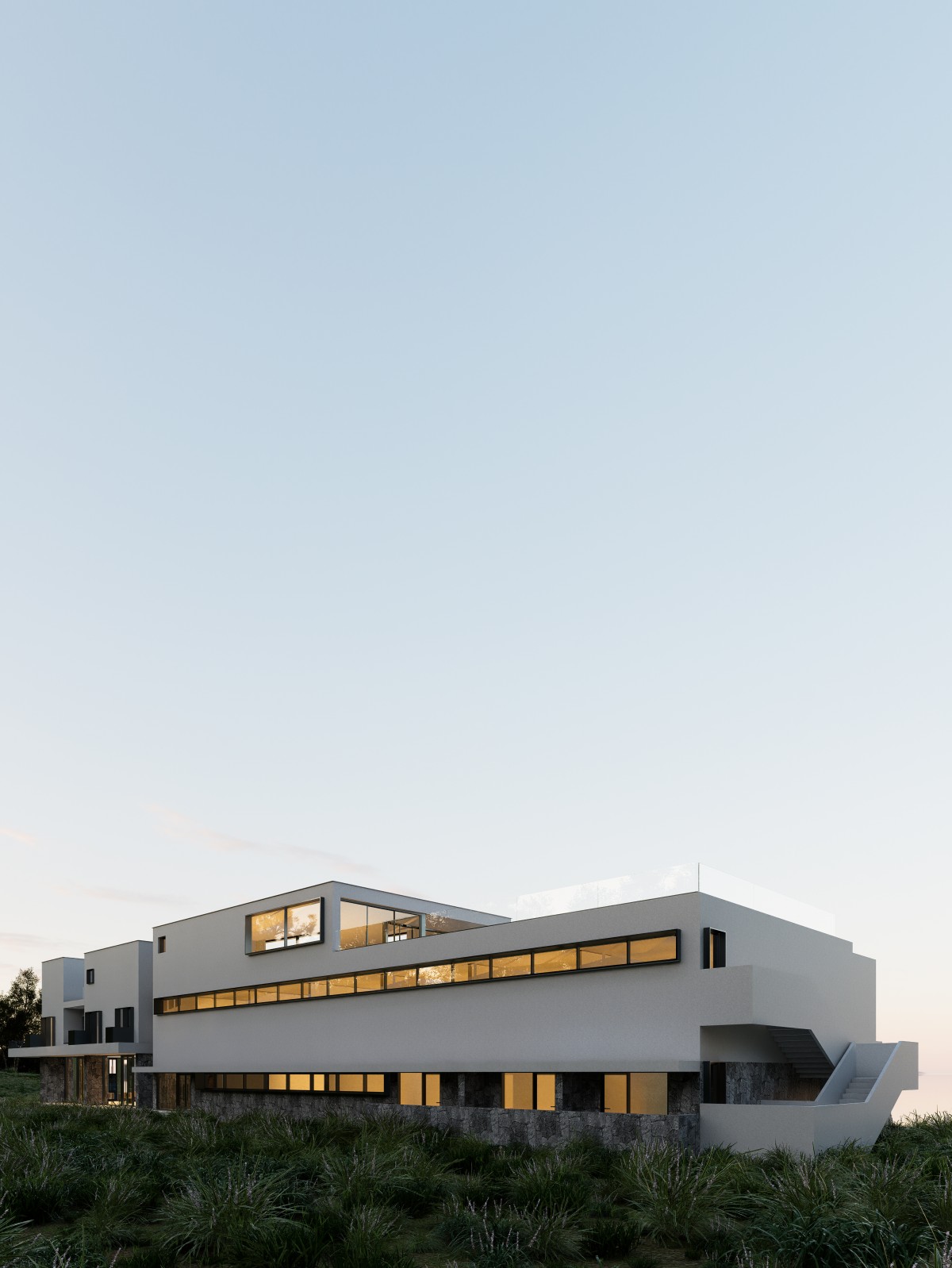 空间体验以“流动与穿透”为主导。首层大厅的通透落地玻璃(Full-height Glazing)消解了内外界限,将海景直接“装裱”入室;而无边泳池(Infinity Pool)的水面与远海视觉连接,模糊了地平线,强化了空间的无限延伸感。材料选择极尽克制:纯白色调(Pure White Finish)与简约体量减少视觉噪音,让自然成为主角;混凝土与玻璃的搭配,在粗犷与精致间取得平衡,呼应了山海的原始质感。光影设计上,片墙与走廊在不同时段投射变化的光影,使框景画面随时间和季节动态演变,增强了空间的诗意与永恒性。