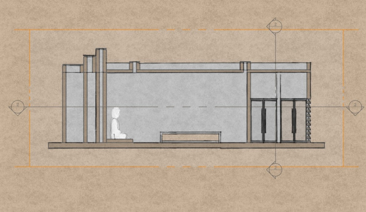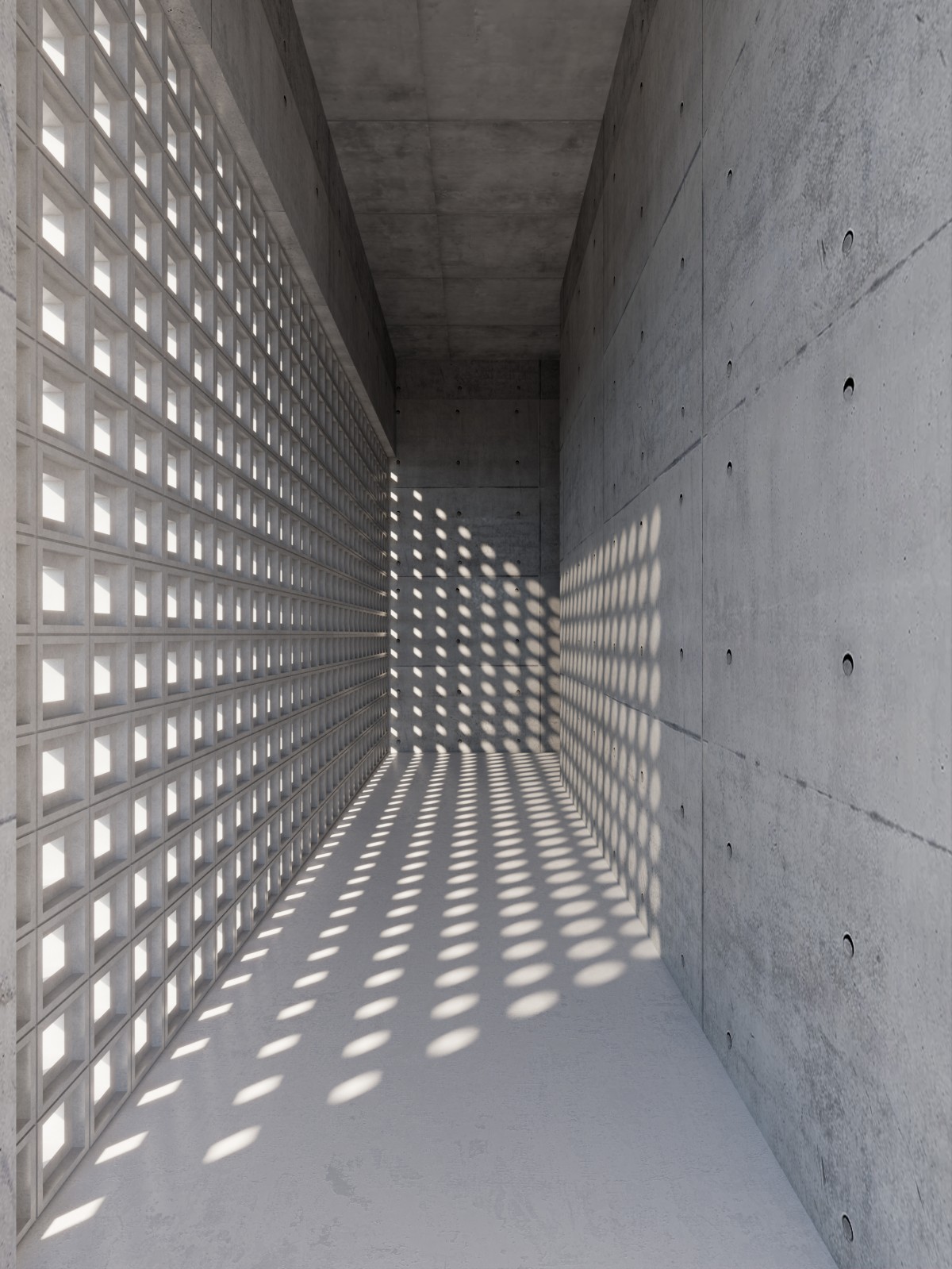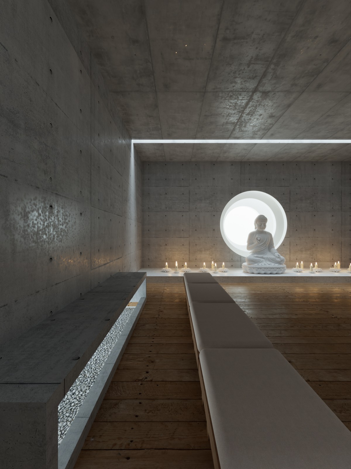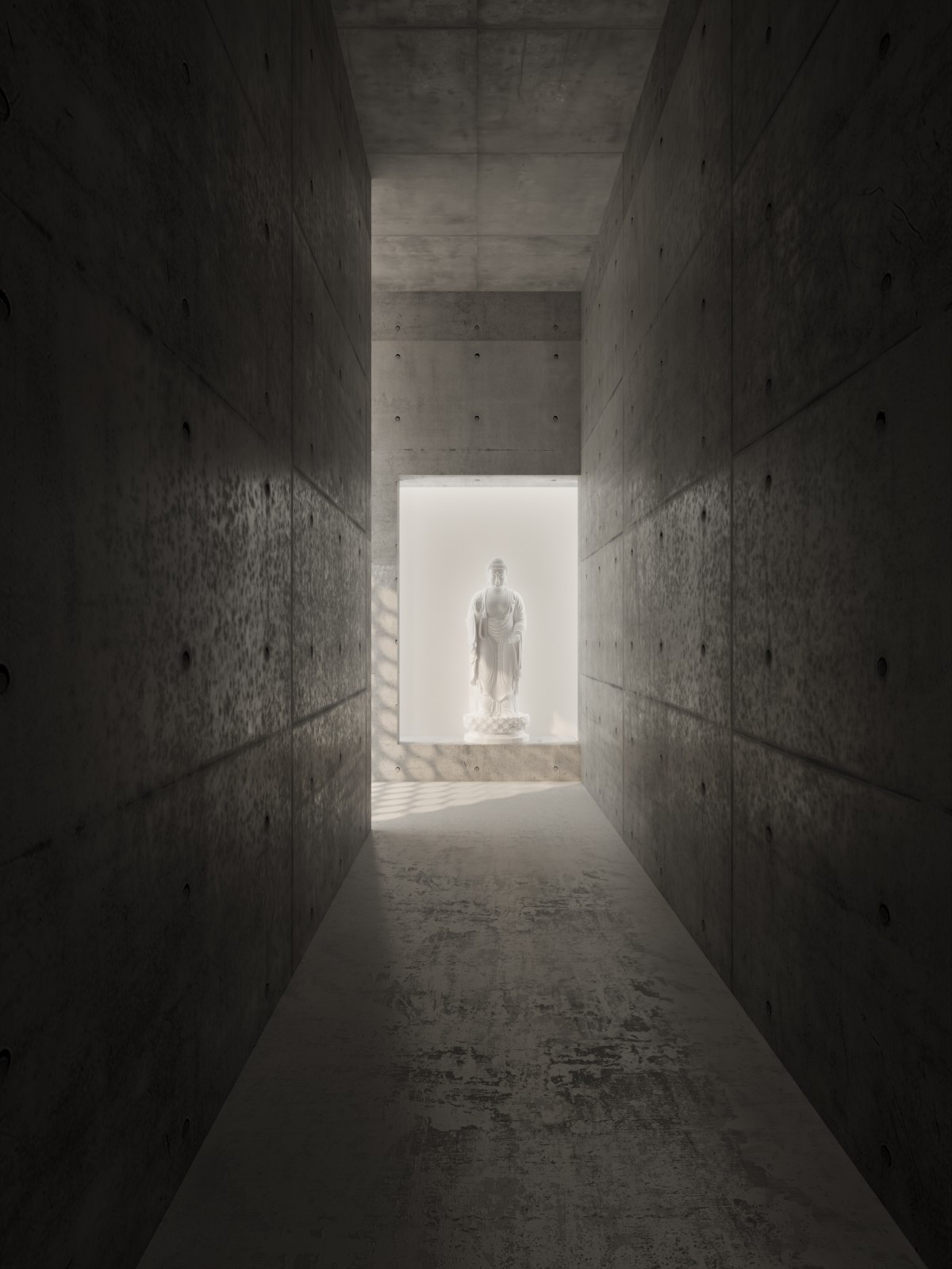 我们将建筑视为一个承载“空”的容器,而光,则是引导心智走向宁静的唯一媒介。设计的核心,是从对物理形态的关注,转向对光的现象学探索。进入建筑的体验,是一场精心编排的、剥离感官的仪式性旅程。访客首先面对的是一个沉默无窗的清水混凝土体量,唯一的入口暗示着一个与外界截然不同的内在世界。步入其中,一条由多孔水泥砖砌成的迂回廊道,将炽烈的日光过滤成柔和、斑驳的光影,洒在水泥地面上,这是从喧嚣到宁静的第一个过渡。廊道的尽头并非直接通达,而是一个被天光精准照亮的壁龛——佛像被置于墙体与玻璃夹层构成的“光盒”之中,仿佛悬浮于虚空,成为序列中的第一个精神锚点,引导访客完成第一次聚焦。绕过壁龛,经过第二次转折,空间的压抑感逐渐释放,最终,主厅豁然呈现。这一系列迂回、转折与光影的递进,并非简单的流线设计,而是一套完整的空间叙事,旨在通过身体的移动,逐步引导心绪从纷繁走向沉静。