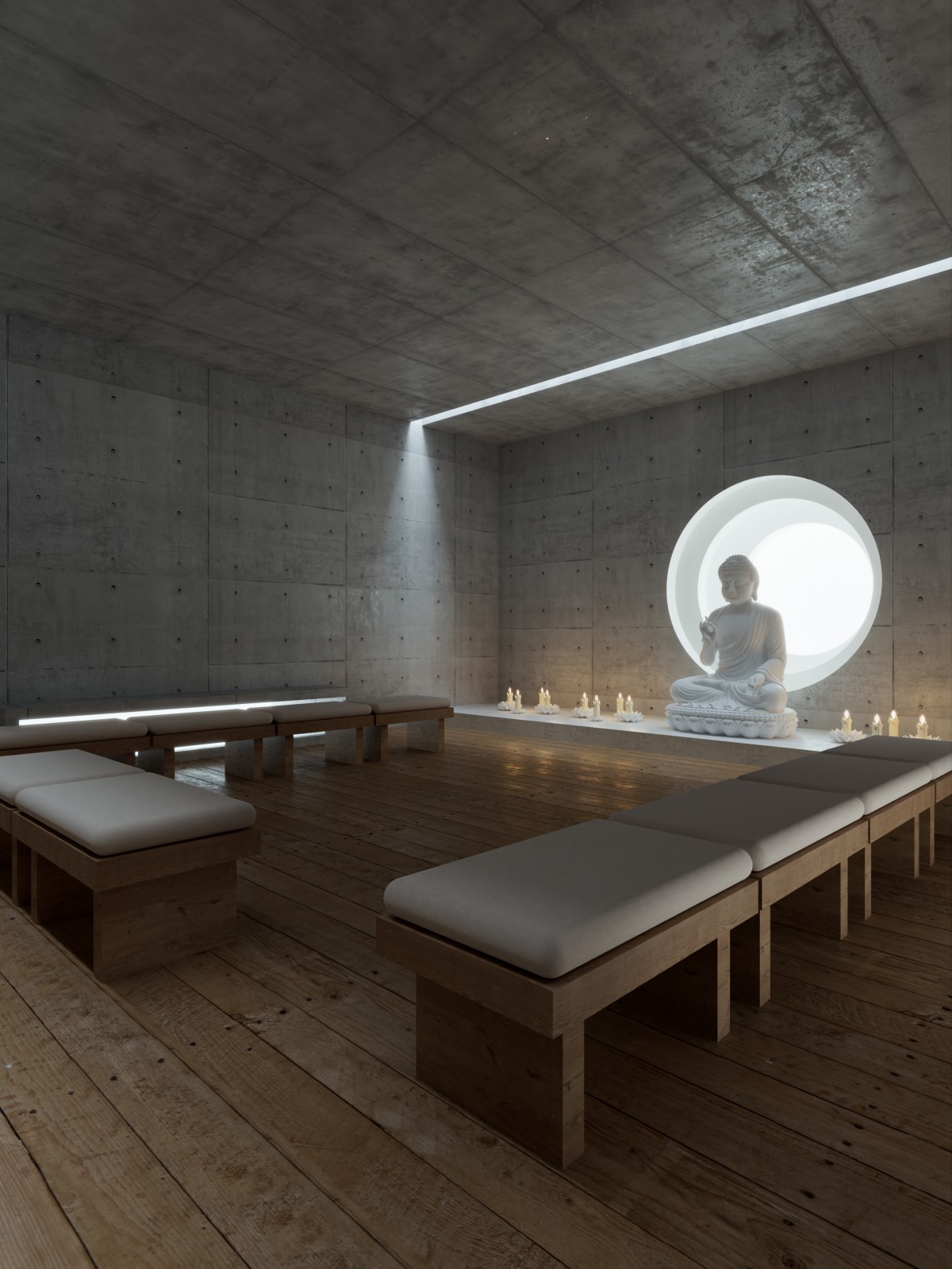 在这个空间里,时间不再是线性的流逝,而是通过光影的移动被感知为一种“呼吸”。随着日照角度的变化,主厅内的“佛光”会缓慢地移动、改变强弱,如同空间在进行着一场宁静而深沉的吐纳。这种缓慢的、非强制性的变化,恰好契合了冥想时呼吸的节奏,帮助修行者调整心神,进入更深层次的专注。