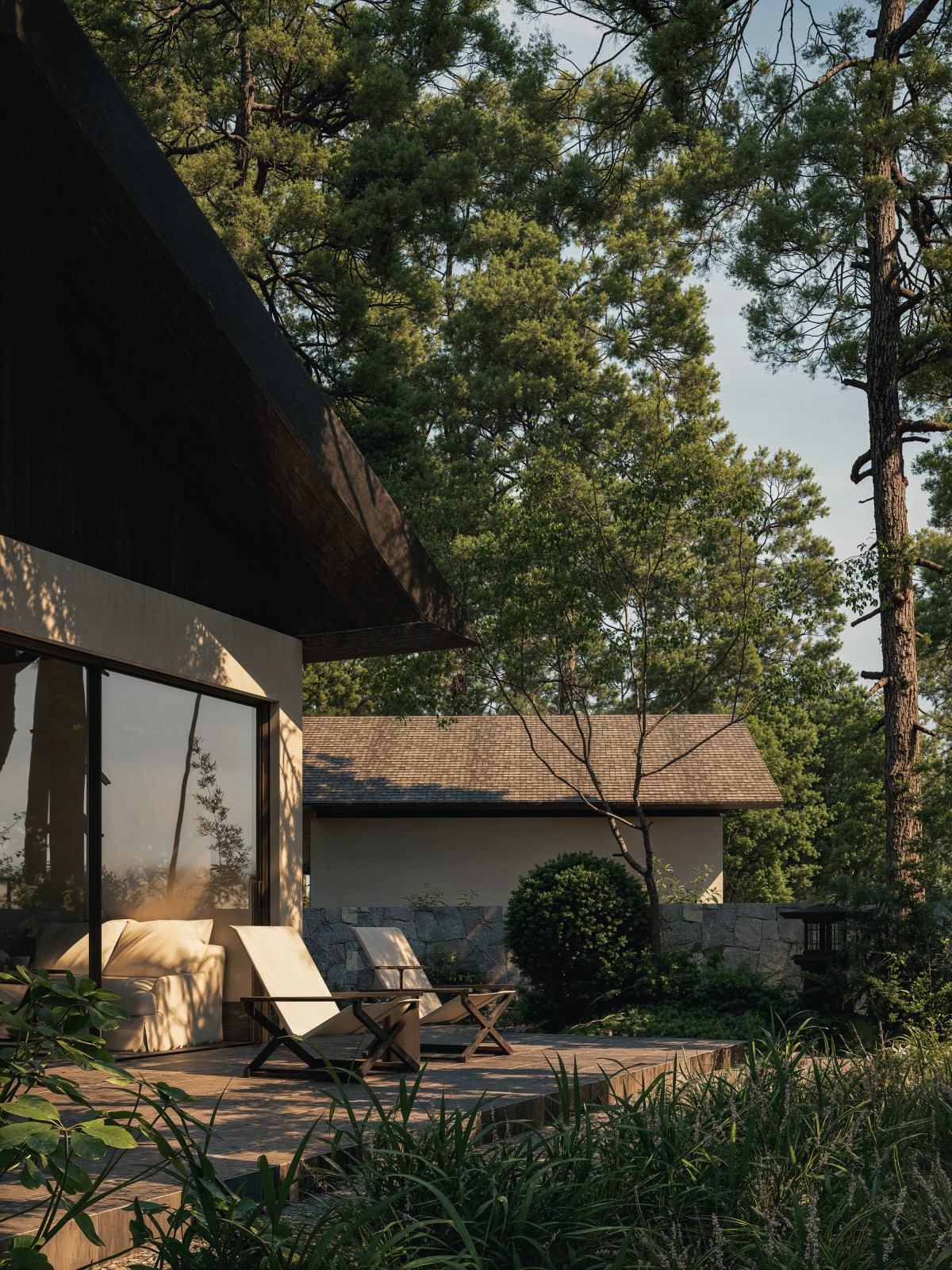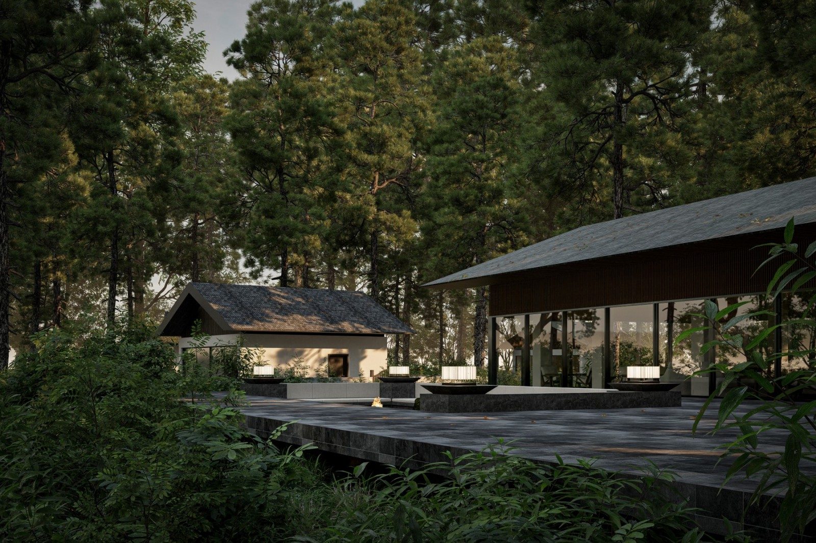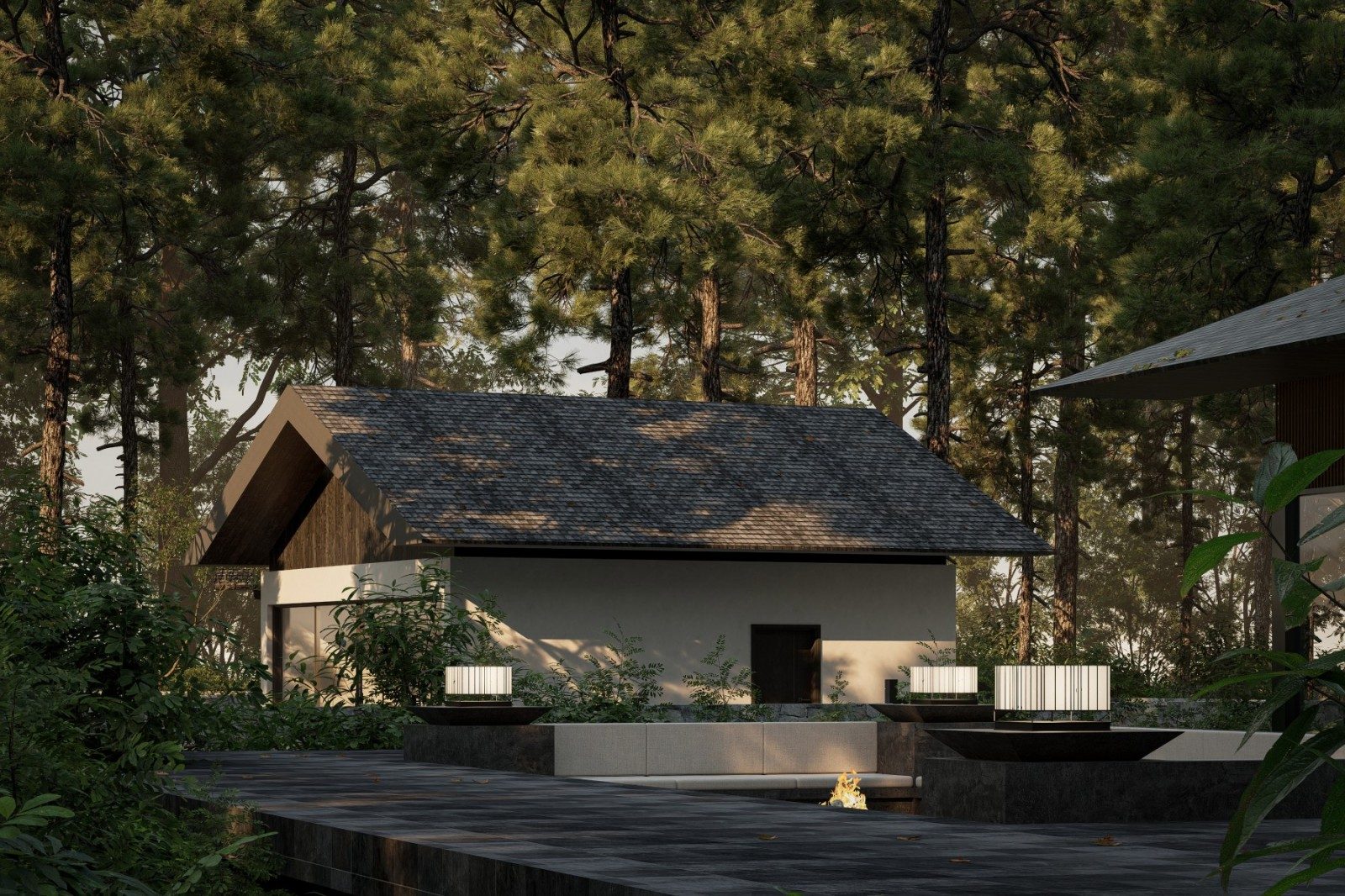 “归处”则是空间体验的目的地。规划上,以一座兼具接待与餐饮功能的公共建筑为核心,串联两处休闲独栋,形成“心(到达)· 息(聚合)· 栖(放松)”的节奏序列。这一序列并非强制性的动线,而是隐于林间的、可供自由探索的“生活线索”,引导住客从城市的喧嚣节奏,逐步沉入自然与内心的静谧。