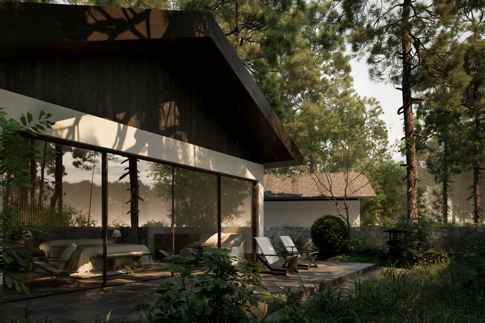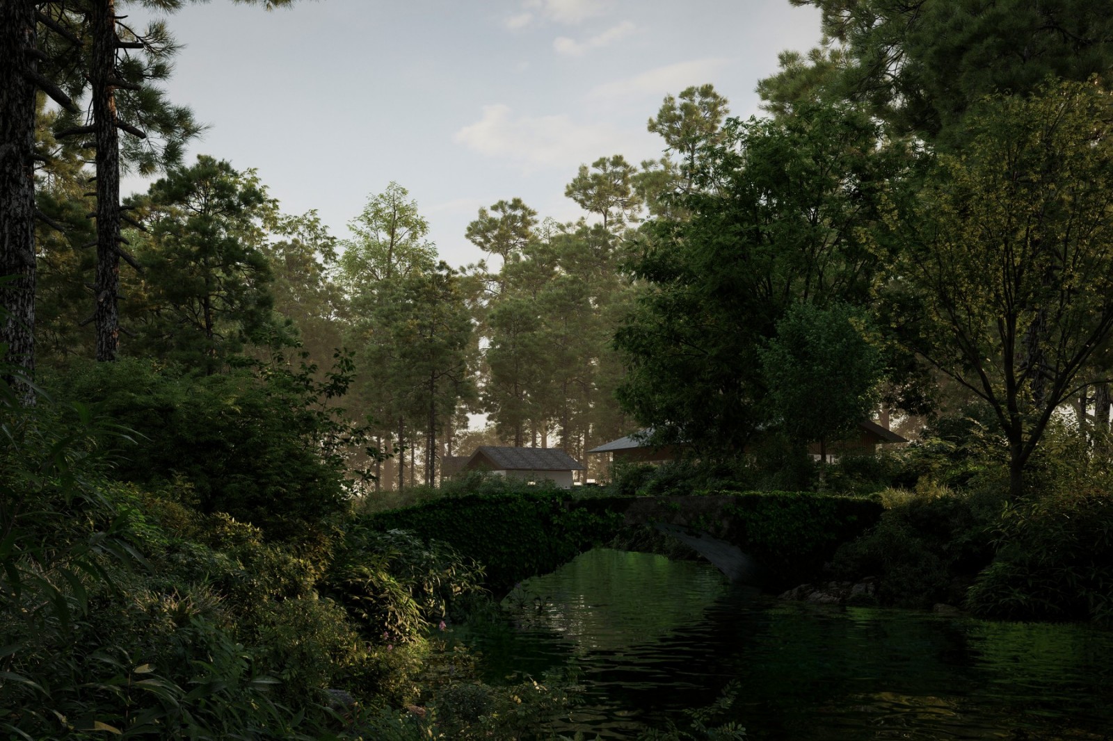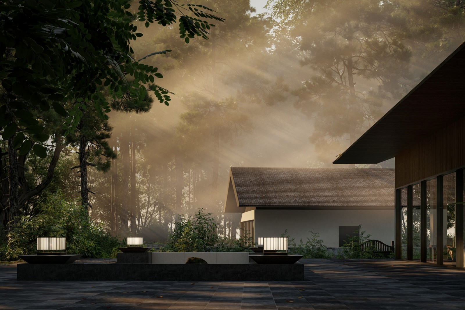“归处”则是空间体验的目的地。规划上,以一座兼具接待与餐饮功能的公共建筑为核心,串联两处休闲独栋,形成“心(到达)· 息(聚合)· 栖(放松)”的节奏序列。这一序列并非强制性的动线,而是隐于林间的、可供自由探索的“生活线索”,引导住客从城市的喧嚣节奏,逐步沉入自然与内心的静谧。