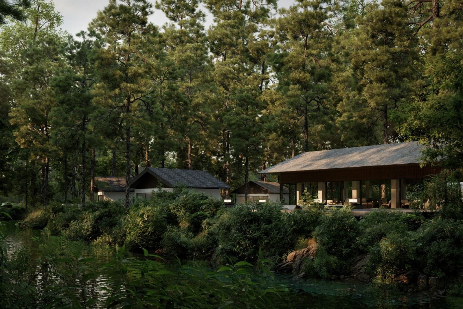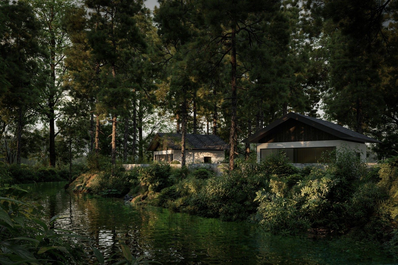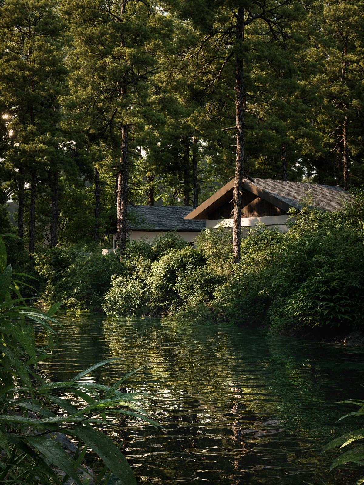 设计以“留白·归处”为总纲,展开一套克制的叙事策略。“留白”是形式与空间的态度:建筑体量化整为零,仅布置十余栋60平方米的独栋客房,以大于15米的间距“散落”于林间,形成低密度、高私密性的聚落形态。建筑采用极简的坡顶方盒子语言,白色素墙与深色木构挑檐抽象演绎川西民居神韵,最终如一组“素白对话”般轻盈地锚固于地形之上,最大限度地消解体量对森林与湖岸线的视觉冲击。