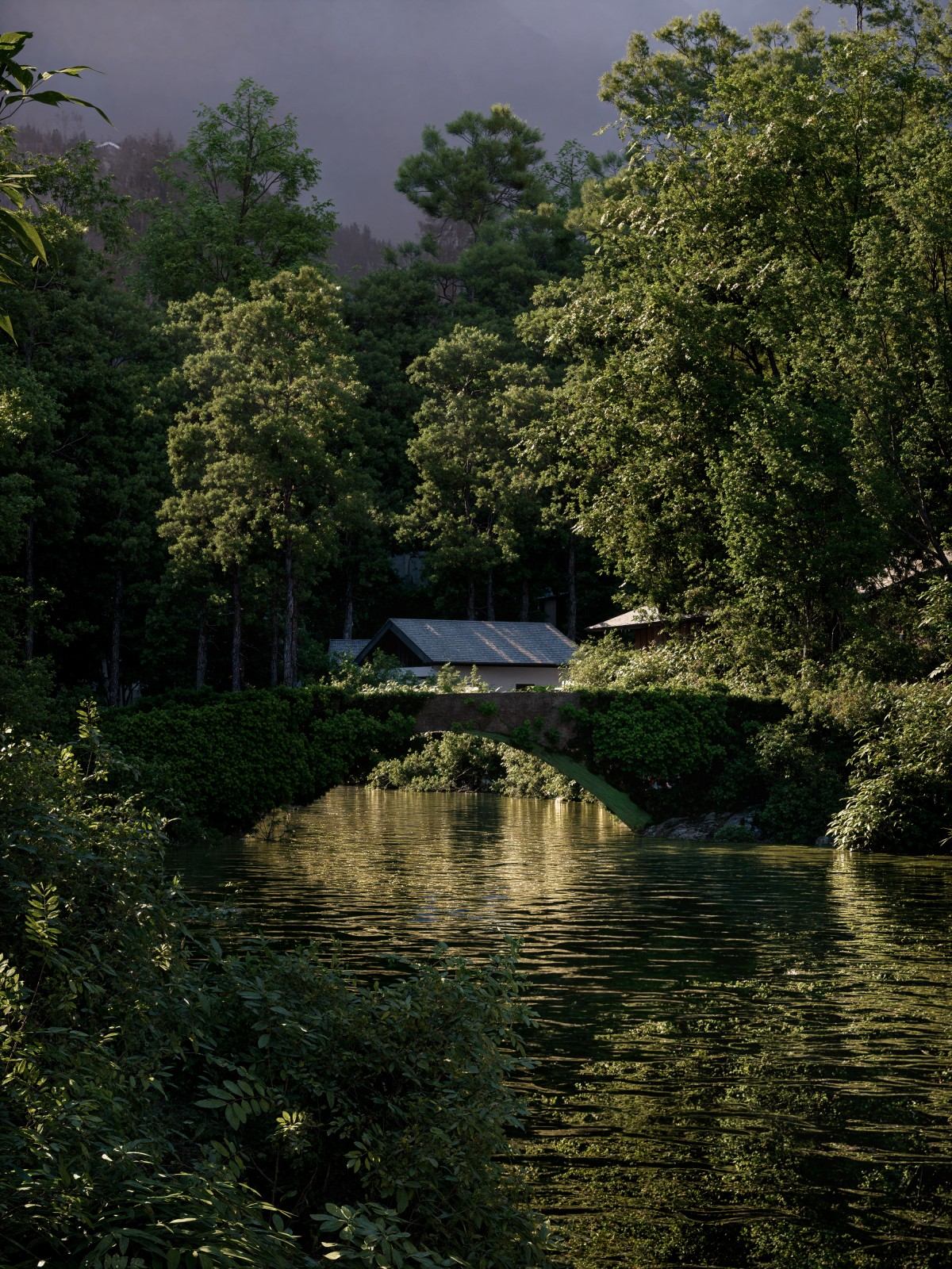 本项目坐落于成都西郊,一处被城市发展温柔环抱的生态飞地——桃花湖。场地拥有180亩清澈水域与400亩原生密林,其核心价值不仅在于“都市天然氧吧”的微气候,更在于它是珍稀物种成都鱲(桃花鱼)的最后栖息地,以及毗邻非物质文化遗产博览园的文化区位。这构成了项目独一无二的起点:如何在极度敏感的生态基底与厚重的川西文化脉络中,植入现代度假功能,实现“建设”与“保护”、“当代”与“传统”的平衡共生?设计的答案,并非创造地标,而是编织一个让一切悄然发生的“背景”。